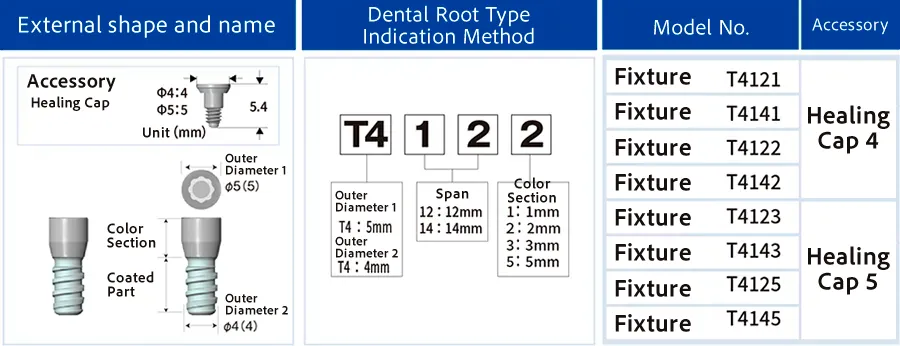 The AQB T-type one-piece implant has a total of 33 combinations of thickness (diameter), covered length (within bone), and abutment length.