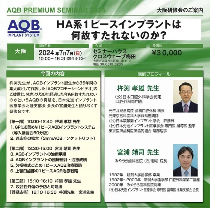 AQBインプラント35年の臨床実績をお持ちの日本先進インプラント医療学会 指導医 監事 杵渕 孝雄先生と日本先進インプラント医療学会北陸支部支部長 宮浦 靖司先生のコラボによるセミナーで、『AQBインプラントが何故すたれないのか?』『臨床医の実体験より何故に愛用するのか?』AQB1ピースインプラントの魅力とHAコーテイングの素晴らしさを存分に語っていただき、AQBの良さを再認識することのできた実りある研修会となりました。